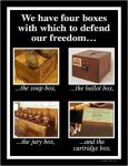 I like to take a moment and review the boxes in your clip. The soapbox; is limited to who can hear you. Even here in the 21st century with Electronic Media, someone has to take time to sit and read what you have to say. The jury box; although many cases have been made, to defend the constitution the court is still limited to just a few people. The cartridge box although I know that not everyone will agree with me, can only be used/should only be used to defend life. So in my point of view the only box that everyday Americans have to defend our way of life, is the ballot box.